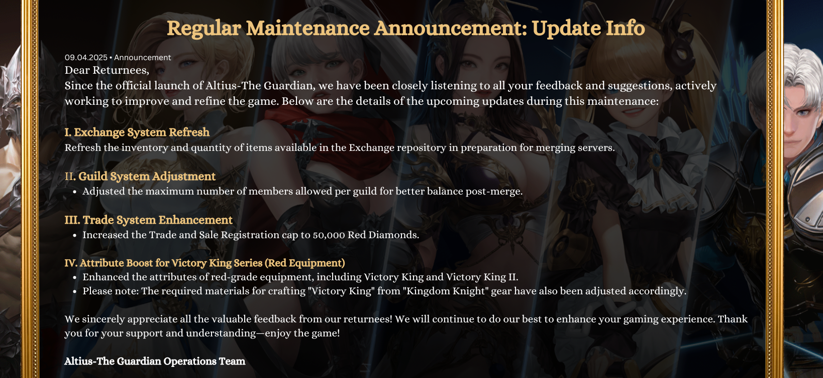 Today’s maintenance was originally planned to support the upcoming server merge, and we truly wanted to make sure everything—from your accounts to your in-game assets—would be transferred safely and accurately.
