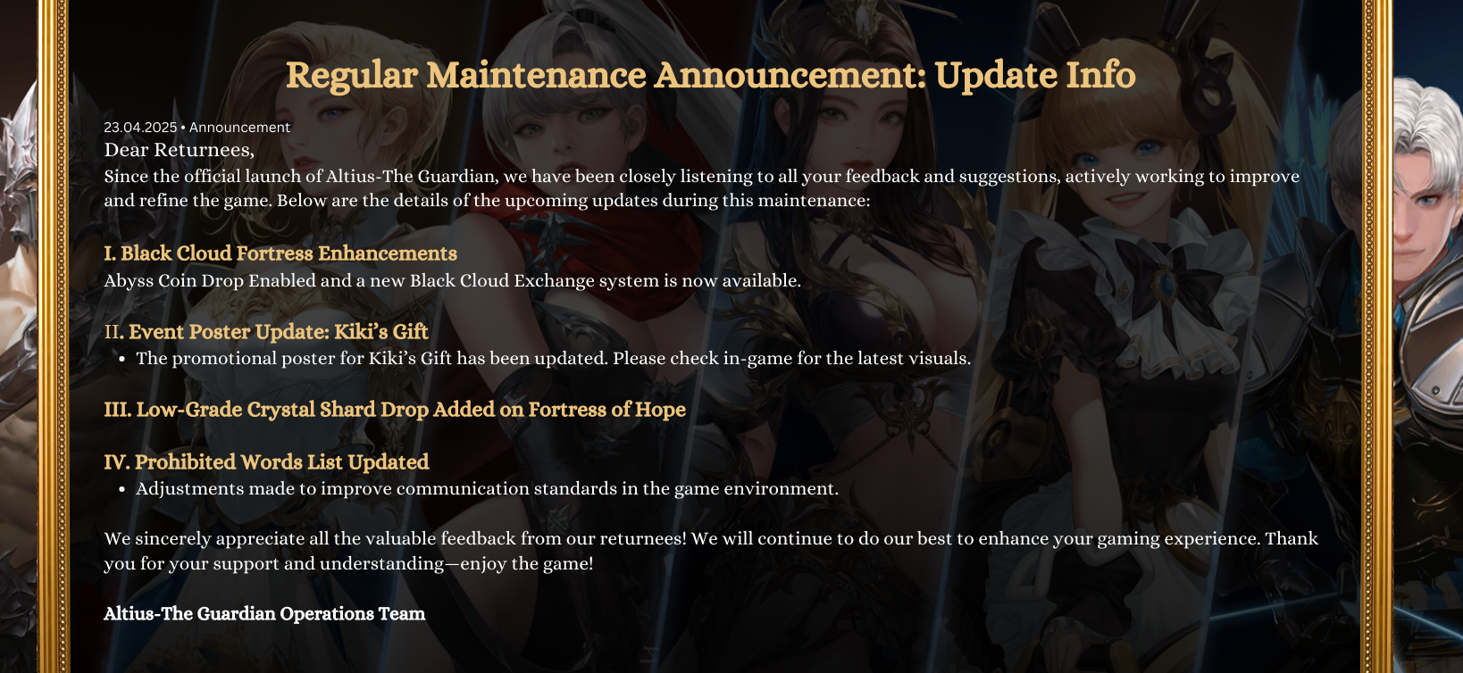 We are pleased to inform you that the recent maintenance for Altius: The Guardian has been successfully completed, and the game is now officially open again! 🎉